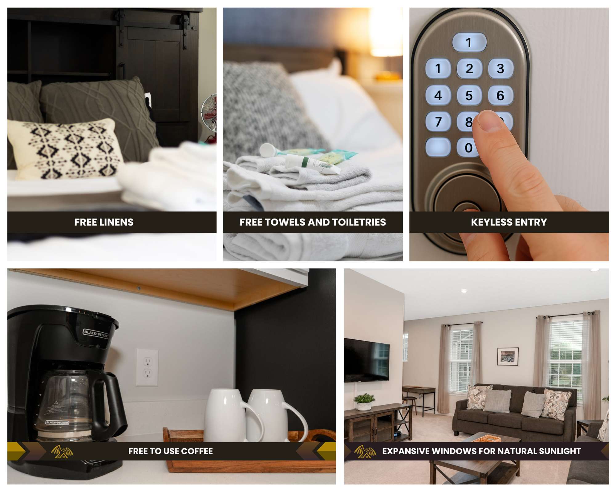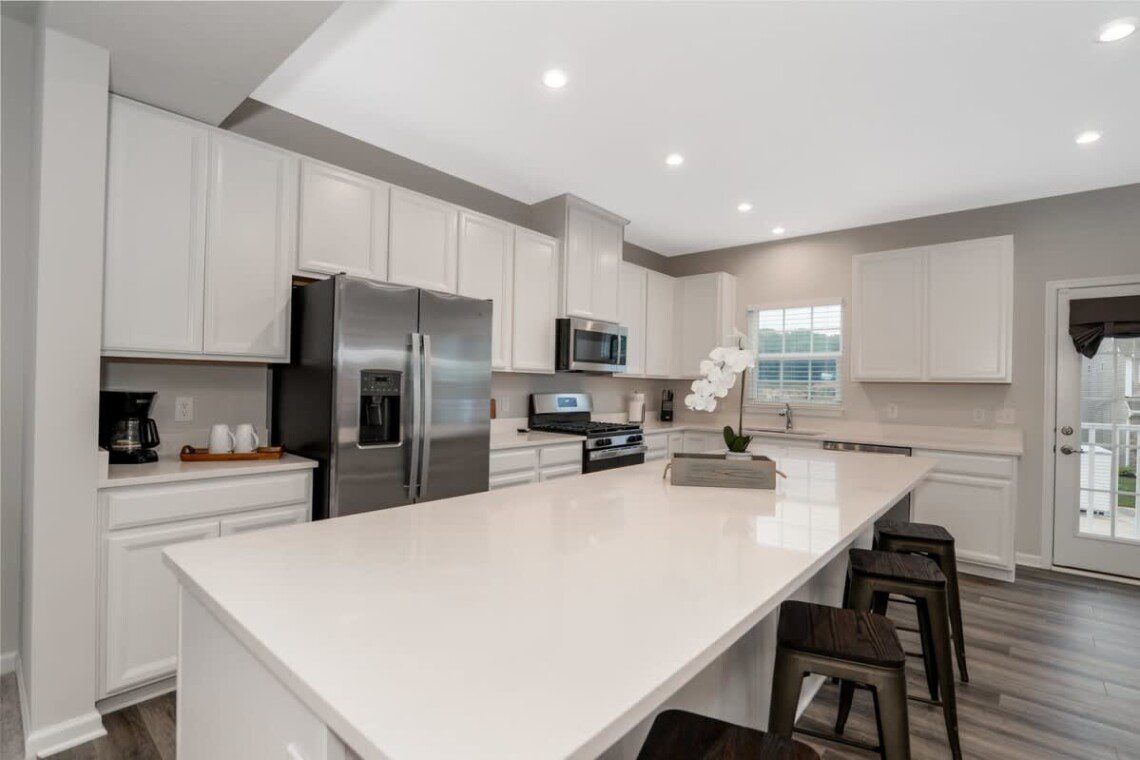 🍳 Kitchen & Dining: A bright, open-concept kitchen and dining space designed for cooking, gathering, and creating memorable meals together. The fully equipped kitchen features new stainless steel appliances and a massive island that doubles as both prep space and a cozy spot to sit and chat. Start your mornings at the coffee station, complete with Keurig and drip options. With cookware, dishes, and utensils all provided, preparing meals is effortless. The dining area seats six and is surrounded by large windows that fill the space with warm, natural light.