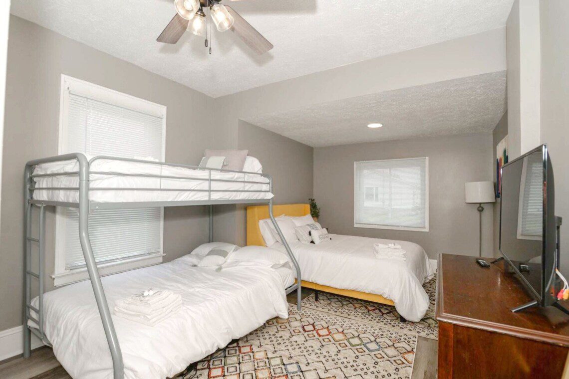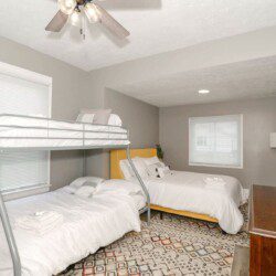 ✔ Main Floor Bedroom: Queen bed + bunk bed, ideal for families with kids or mixed groups.