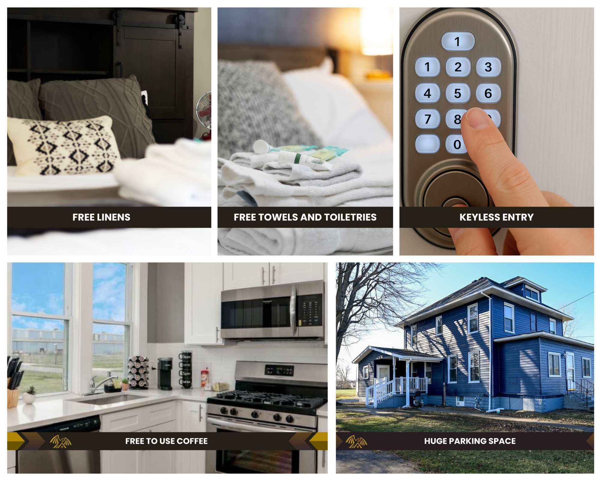 ✔ Second Floor Bedrooms: Four spacious rooms featuring plush queen beds, cozy linens, and calming décor. One bedroom also includes a twin bed, perfect for additional guests or children.